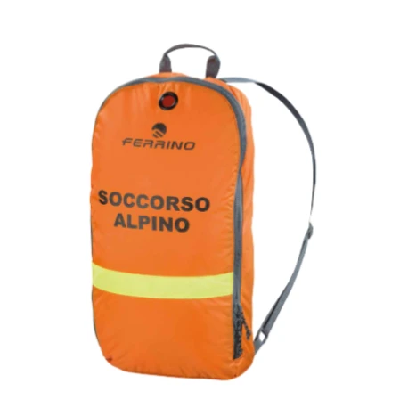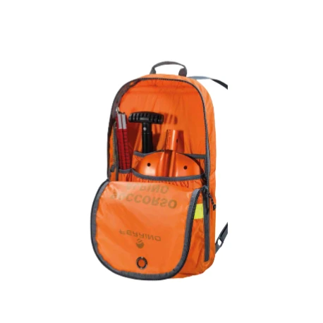 Contenitore in tessuto Poliestere Oxford realizzato per il trasporto del materiale per intervento su valanga, ampia apertura con cerniera rinforzata e doppio cursore, inserto frontale ad alta visibilità rifrangente, tasche interne, dorso imbottito, maniglie e spallacci in nastro.