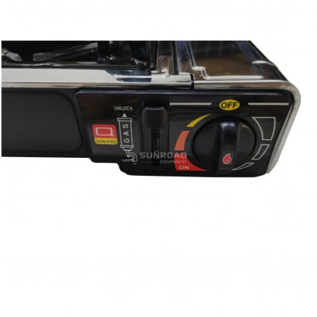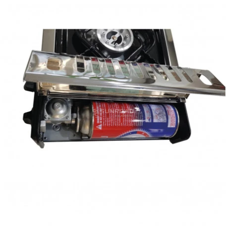 Il fornello presenta un’accenzione piezoelettrica con una manopola elettrica per regolare la potenza della fiamma e la disconnessione automatica della cartuccia in caso di sovrapressione.