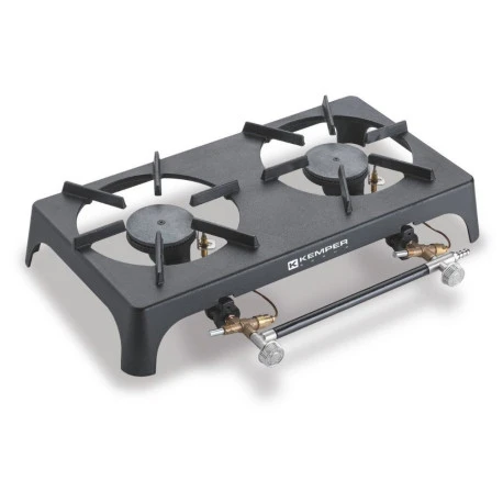 Fornellone portatile in ghisa con due bruciatori indipendenti a potenza regolabile, dotato di valvola di sicurezza con termocoppia.
