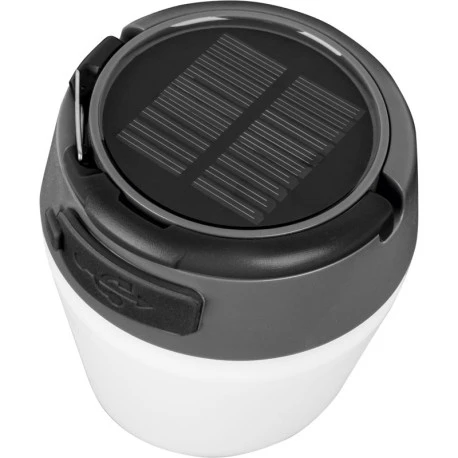 Lampada da campeggio ricaricabile dotata di cellula fotovoltaica integrata e di compatibilità con USB e con gancio per appenderla.