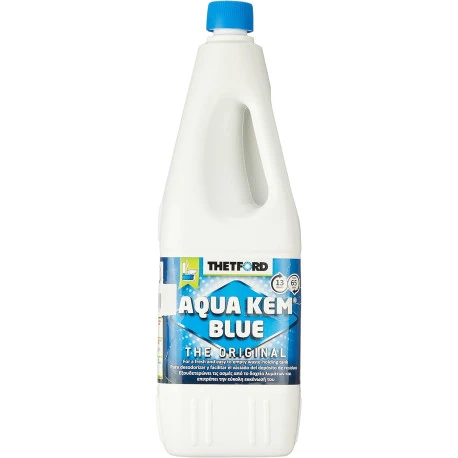Liquido additivo Aqua Kem per l’utilizzo nei serbatoi di scarico delle acque nere dei WC chimici, ad azione disgregante e deodorante. Confezione da 2 lt.