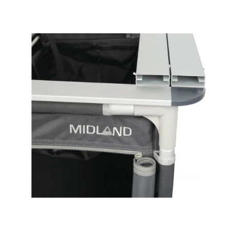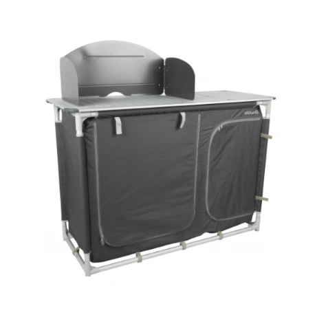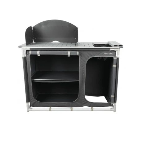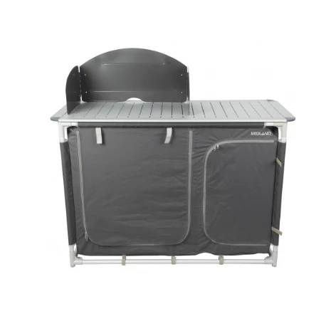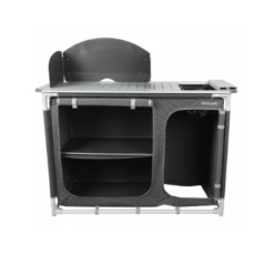 Il mobile da cucina Vega di Midland è progettato per offrire uno spazio di cottura ottimizzato a campeggiatori e amanti della vanlife. Con i suoi due ripiani, permette di riporre facilmente utensili, condimenti e provviste al riparo da polvere e umidità. Il suo ampio piano di lavoro offre una comoda superficie per preparare i pasti, anche all’aperto.