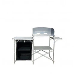 Mobiletto pieghevole porta fornello con struttura in alluminio, due superfici di lavoro e paravento removibile incluso, borsa con chiusura a zip con due ripiani interni per riporre piatti e utensili, ulteriore piano di appoggio in alluminio.