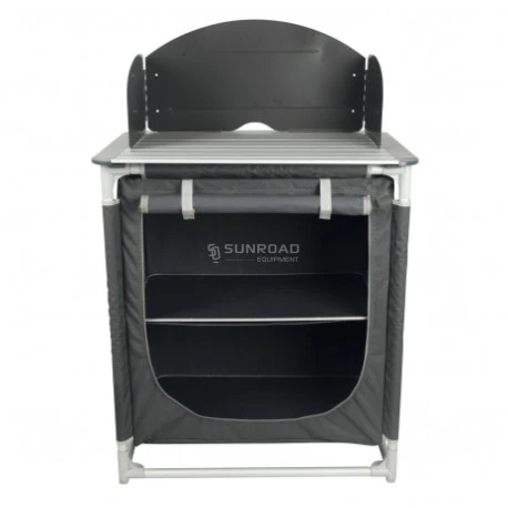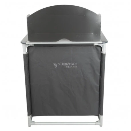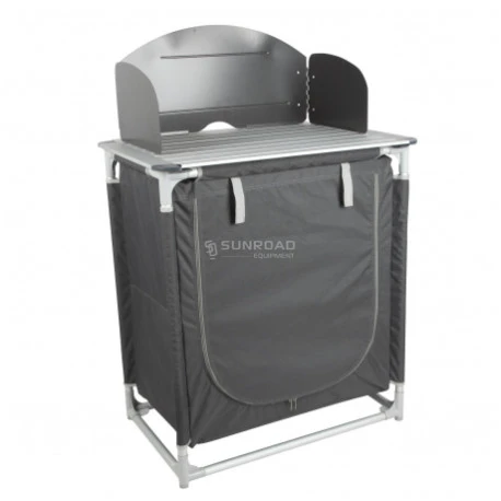 Mobiletto portafornello provvisto di barriera anti vento removibile, piano superiore in alluminio arrotolabile, unità di stoccaggio chiusa con tue piani d’appoggio rigifi removibili.