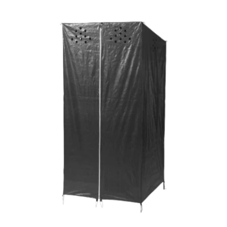 Aerazione assicurata da un’ampia apertura al suolo e fori nella parte alta. Ancoraggio del telo ai quattro montanti dell’armatura e a terra con tiranti in corda e picchetti.