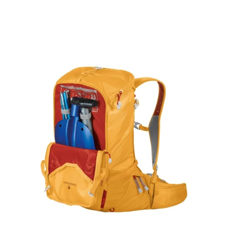 Tasche: Tasca frontale porta pala e sonda. Comparto inferiore porta ramponi e porta corda, sul cappuccio, posteriore, su fascia a vita e in rete sugli spallacci.